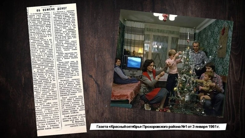 1 января 1961 года в Советском Союзе ввели новые деньги. Сталинские «портянки» заменили на новые хрущёвские «фантики», меньшие по размеру, но более дорогие по номиналу. О новогоднем подарке 1961 года страну предупредили заранее. «Завтра по всей стране начнут работать обменные пункты Госбанка», - писали все газеты Советского Союза. Вышел в путь новый советский рубль. «Твёрдый и уверенный шаг у него. Позади остаются и франк, и фунт стерлингов, и одряхлевший хвастун - американский доллар. Теперь он стоит 90 копеек». В центральных газетах было опубликовано описание и образцы новых денег. «Завтра тысячи и миллионы советских людей увидят, будут держать в своих руках, нести в магазин новые деньги. Готовы к обмену денег и работники Белгородского городского управления Госбанка».